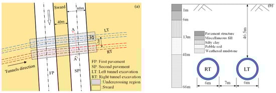 Illustration of excavated tunnels undercrossing airport runway: (a) plan view; (b) typical cross-section A-A’.