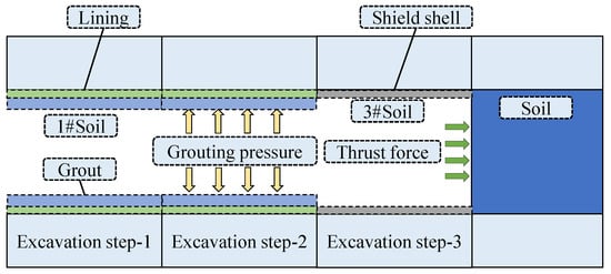 In the simulation of the tunnel excavation, an excavation step was set as twice the duct piece width (2.4 m). The simulation of soil excavation, shield tunnelling, segment installation and synchronous grouting were realized via the element birth–death method; the excavation simulation diagram is shown in Figure 8. The detailed process is as follows: