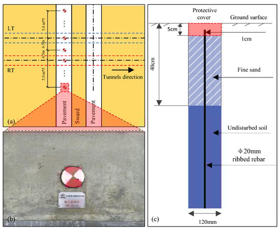Distribution layout of monitoring points: (a) distribution of monitoring points; (b) site map of settlement monitoring points; (c) schematic diagram of monitoring points by hole-drilling method.