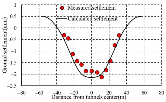 With the rapid development of computer techniques, finite element numerical simulation is becoming the most efficient way to simulate the construction procedure of underground engineering under various complex environmental conditions [,,]. For instance, Shan et al. [] investigated the effects of shield tunnel construction on the differential settlement and the soil dynamic stress of an adjacent culvert-embankment transition zone via finite element analysis. Fattah et al. [,,,] investigated the shape of the settlement trough caused by tunnelling in cohesive ground by analytical solutions, empirical solutions and the finite element method. Chakeri et al. [] established a three-dimensional numerical model to analyse the effect of tunnel spacing, horizontal distance between tunnels and excavation sequence on surface settlement. Michael et al. [] simulated the shield tunnel mechanical excavation process including variable muck pressure, cutterhead overcut, shield conicity, installation of jointed segmental lining, annular gap grouting based on ABAQUS. Then, the development of ground deformations and internal forces of the lining were studied.