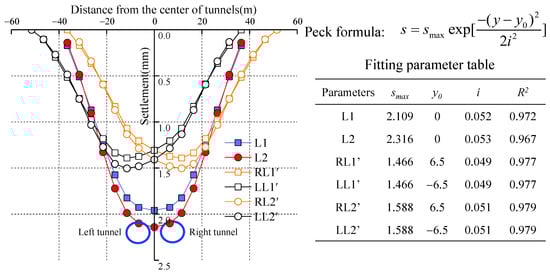 Based on the proposed model, the influence of the double-line tunnel excavations on ground surface settlement was investigated. When the double-tunnel excavation was finished, the ground surface settlement curves along the runway pavement longitudinal section are shown in Figure 11. L1 and L2 represent the sections of the runway midline and sward midline, RL1′ and RL2′ are the sections of runway midline and sward midline when the right-line tunnel excavation was finished and LL1′ and LL2′ are the sections of runway midline and sward midline when the left-line tunnel excavation was finished, respectively. The ground surface settlement curves of RL1′, LL1′, RL2′ and LL2′ were normally distributed and the Peck formula was used to fit the settlement trough. As shown in Figure 8, there was a good fit between the settlement trough and the Peck formula. The settlement of the monitoring points above the tunnel axis was maximum. The farther the monitoring point from the shield tunnel axis, the smaller the ground surface settlement. The ground surface settlement induced by a double-line shield tunnel excavation was always larger than that induced by a single-line shield tunnel excavation for different sections.