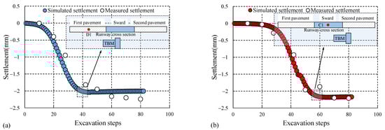 The settlement variation of the characteristic monitoring point (D1) on the runway pavement and characteristic monitoring point (C1) on the sward with excavation steps is shown in Figure 12. When the shield machine advanced to the 40th loop, the settlement of D1 reached the maximum value of 1.96 mm. When the shield machine advanced to the 60th loop, the settlement of C1 reached the maximum value of 2.14 mm. After excavation step 40, the settlement increased slightly and the rising value basically remained at 1 × 10−3 mm. Similarly, after excavation step 60, there was a very small decrease of the settlement and the rising value basically remained at 0.5 × 10−3 mm. The magnitude of the increase was very small. Basically, it can be considered that the settlement is stable and the small amplitude increase of this settlement is probably caused by the formation of the shield shell and lining segment.
