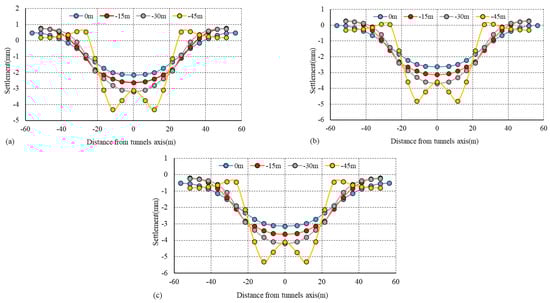 To investigate the stratum displacement at different stratum depths affected by tunnel excavation, the settlement curves of the sward midline cross section at the ground surface and 15 m, 30 m and 45 m below the ground surface were calculated by the established model, as shown in Figure 13. It can be concluded that the ground settlement above the tunnel increased with the stratum depth and the maximum stratum settlement occurred above the tunnel axis. For condition 1, the maximum settlement of the ground surface was 2.14 mm and the maximum settlement of the stratum 45 m below the ground surface was 4.30 mm. For these conditions, the settlement curves of the cross section in the shallow stratum were V-type troughs. However, the settlement curves of the stratum near the tunnel top were W-shaped troughs and the maximum settlement occurred above the left and right tunnels.