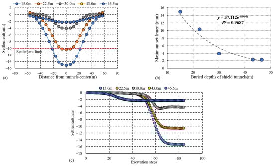 Influence of buried depth on ground surface settlement. (a) settlement trough. (b) the relationship between maximum settlement and tunnel burial depth. (c) settlement development.