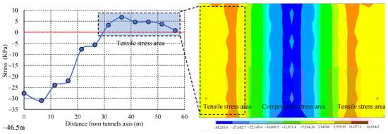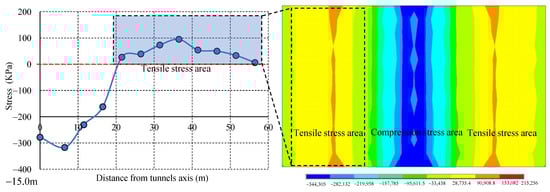 The stress in the x direction of the runway in the transverse section when the buried depth = 46.5 m is shown in Figure 15. The pavement within 29.8 m of the shield tunnel axis was subjected to compressive stress. When the pavement was 56.5 m away from the tunnel axis, the stress basically dissipated to 0 kPa and the pavement 29.8–56.5 m away from the shield tunnel axis was subjected to tensile stress; the maximum tensile stress was 6.82 kPa.