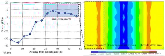 The stress in the x direction of the runway in the transverse section when the buried depth = 43.0 m is shown in Figure 16. The pavement within 28.1 m of the shield tunnel axis was subjected to compressive stress. When the pavement was 56.5 m away from the tunnel axis, the stress basically dissipated to 0 kPa and the pavement 28.1–56.5 m away from the shield tunnel axis was subjected to tensile stress; the maximum tensile stress was 8.56 kPa.