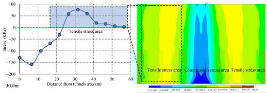 The stress in the x direction of the runway in the transverse section when the buried depth = 30.0 m is shown in Figure 17. The pavement within 23.8 m of the shield tunnel axis was subjected to compressive stress. When the pavement was 56.5 m away from the tunnel axis, the stress basically dissipated to 0 kPa and the pavement 23.8–56.5 m away from the shield tunnel axis was subjected to tensile stress; the maximum tensile stress was 76.10 kPa.
