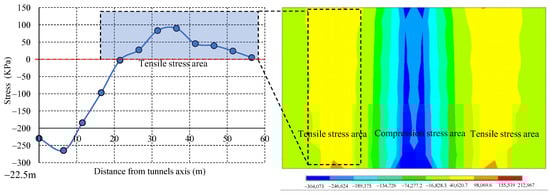 The stress in the x direction of the runway in the transverse section when the buried depth = 22.5 m is shown in Figure 18. The pavement within 21.6 m of the shield tunnel axis was subjected to compressive stress. When the pavement was 56.5 m away from the tunnel axis, the stress basically dissipated to 0 kPa and the pavement 21.6–56.5 m away from the shield tunnel axis was subjected to tensile stress; the maximum tensile stress was 89.77 kPa.