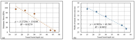 Influence of buried depth on ground surface settlement. (a) maximum stress vs. tunnel burial depth; (b) tensile stress area width vs. tunnel burial depth.