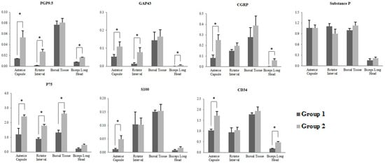Gene expression analysis revealed increased expression of pain-related factors with the pathologic change of the LHBT itself (group 2). Significant responses were shown in PGP9.5 (0.008 vs. 0.017, p = 0.02), GAP43 (0.001 vs. 0.006, p = 0.03), CGRP (p = 0.003 vs. 0.060, p = 0.007), and CD34 (0.183 vs. 0.472, p = 0.03) (Figure 1).