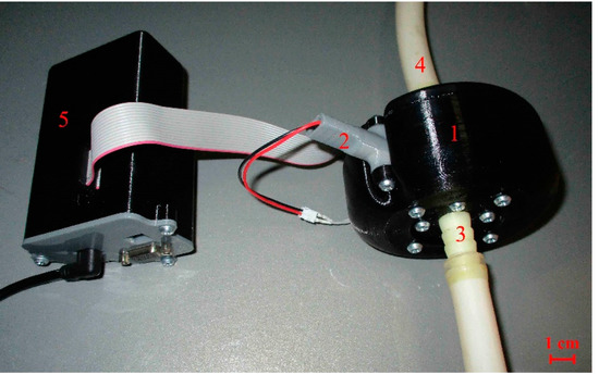 Photograph of the prototype sensor shown schematically in Figure 1: (1) sensor enclosure; (2) laser diode holder; (3) herringbone fitting for 14 mm hose; (4) silicone tube connected to the pumping system; (5) controller unit.