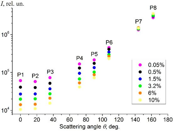 Our experimental tests have shown that it is not advisable to use the forward-scattering angles available in the sensor scheme (Figure 1) for measuring fat content due to the fact that the scattering intensity at these angles is more influenced by large impurity particles; this effect is further shown in Section 3.4. Thereby, fat content measurements are more stable at the side-scatter angles, .