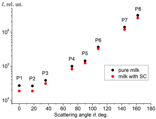 We tested the behavior of the scattering indicatrix of milk with large-scale impurities. To this end, we compared the measurements made for pure milk with a fat content of 1.5%, and the same milk where somatic cells were added with a final concentration of 106 cm−3 (Figure 7).