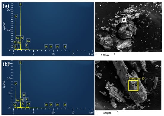 SEM images and EDS spectra of phytoliths are shown in Figure 1. The shape of the phytoliths was similar to that of the previously imaged phytoliths obtained via high-temperature extraction []. Phytoliths were mainly composed of Si and O.