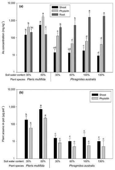 Arsenic in Pteris multifida and Phragmites australis as a function of the water content. (a) As concentration in plant shoot, phytolith, and roots. As in the shoot and roots was calculated based on plant dry weight, and As in phytoliths was calculated based on phytolith weight. (b) The amount of As in plant shoots and phytoliths for each pot. Water content means the percentage of water holding capacity. Different letters in the same color bar indicate significant differences at the 5% level determined via Duncan’s test after log-scale transformation.