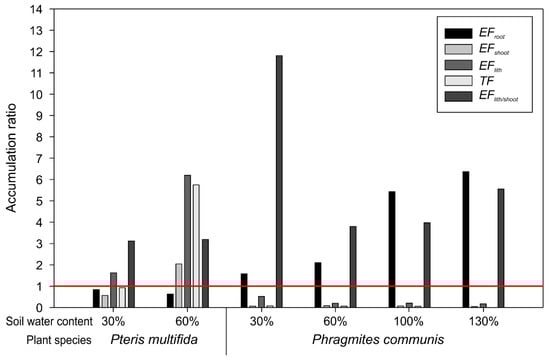 In the soil with 100% and 130% of water holding capacity, plant roots had the highest As concentrations and EFroot values (Figure 2a and Figure 3). This difference can be explained by increased soil As availability, which was obtained via Mehlich-3 extraction (Table 1). However, the As concentration of P. australis shoots did not differ significantly between soil water content conditions (Figure 2a). In the case of P. australis, EFroot increased while TF decreased, and the As concentration in shoots did not show a significant difference. In previous research, the TF of P. australis was lower than 1, with some reported values even being lower than 0.1 [,,,]. Lee et al. [] compared the metal accumulation of fern and Graminae, with the latter having a lower TF. Such a characteristic can explain that P. australis is an As excluder and reduces root-to-shoot translocation as a defense mechanism []. The result of TF in this study also reflects the characteristics of P. australis.