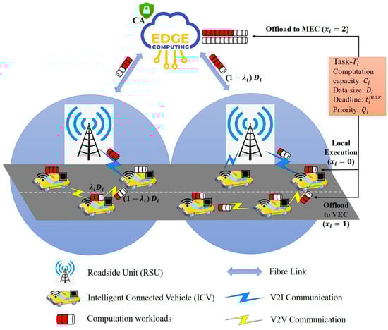 As shown in Figure 1, a regional MEC server receives and transmits workloads between several RSUs via the optical fiber link. Each RSU’s coverage range is assumed as , which equally divides the road into segments. The ICVs are randomly and independently distributed in lanes on the road with an arrival rate . Within the coverage of the RSU, ICV transmits task data between RSU by V2I communication. RSU is assumed as a traditional communication node in the VEN without computation capacity, which is considered as an equipment for message forwarding between the MEC server and the ICVs. Equipped with an onboard unit (OBU) and massive sensors such as cameras, mmWave radar, and lidar, ICV has a certain amount of computation capacity, collecting information from the surrounding environment and sending different types of messages periodically to the RSU or other ICVs within its communication range.