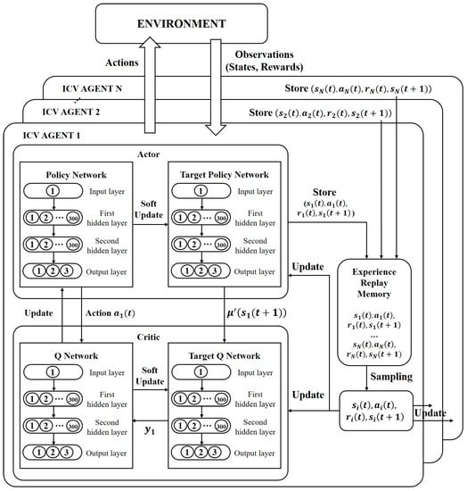 The overall flow of COPP-DDPG algorithm is based on DDPG, as shown in Algorithm 1. DDPG algorithm is widely used and introduced in a large number of studies [40]. Here we will not describe the details of the algorithm. The goal of DDPG is to make the agents obtain the maximum reward, which is guided by the rewards observed by the interaction with the environment. Due to the interaction between multiple ICVs in the VEN environment, the behavior of one ICV has the potential to influence and change the decisions of other ICVs. Therefore, multi-agent DDPG is considered in this work to meet the increasing complexity of environment and task requirements, which takes full account of the cooperation and competition between agents to maximize joint returns. However, with the preliminary experiments, we found that the centralized multi-agent DDPG leads to the problem of poor convergence. Therefore, the COPP-DDPG we finally chose is a decentralized multi-agent DDPG method.