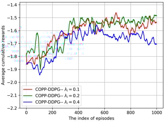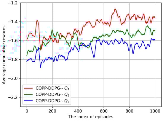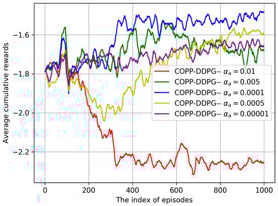 Figure 3 reveals the convergence of COPP-DDPG with different actor learning rates, . The choice of learning rate can obviously affect the convergence effect and the speed of COPP-DDPG. From Figure 3, COPP-DDPG cannot be convergent due to the greater learning rate when . The convergence of COPP-DDPG is obviously improved when , but the result is not satisfactory. When and , COPP-DDPG can converge on certain results, and the proposed algorithm does not perform well. Considering the stability and performance of COPP-DDPG, we set the actor’s learning rate as , which is shown as the blue curve in Figure 3.