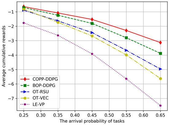 Figure 6 indicates the comparison of five algorithms with different arrival probabilities of tasks . The vehicular task arrival rate represents the probability that ICVs can generate computation tasks in each time slot. When the vehicular task arrival rate is low, the vehicular task is processed in a timely pattern due to the small number of vehicular tasks, so that the computational tasks’ delay is low and the proportion of tasks not processed is greatly reduced, which means that there is less punishment, so the average cumulative reward is greater. As shown in Figure 6, the COPP-DDPG algorithm keeps the best performance no matter what the vehicular task arrival rate is. As ICV’s local processing capacity is the lowest, the performance of LE-VP is the worst. Compared with all vehicular tasks offloaded to the MEC server strategy, although the transmission rate of VEC is better, its computing capacity is lower. Therefore, when the task arrival rate is low, such as , the performance of OT-VEC is better than that of OT-RSU. However, when the task arrival rate is high, the performance of OT-VEC is worse than that of OT-RSU.