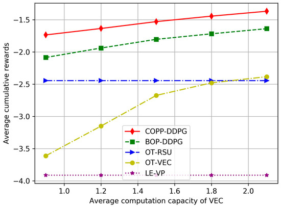 Figure 7 shows the comparison of all five algorithms with different computation capacities of VEC . We set the range of average computation capacity of all available VECs as [0.9, 1.2, 1.5, 1.8, 2.1] GHz. The curves of OT-RSU and LE-VP show that although the computational capacity of VECs is time-varying, the performances of these two algorithms cannot be affected because the average cumulative rewards of them are independent of the computational capacity of V2V. The performances of COPP-DDPG and BOP-DDPG are better than those of other algorithms due to their outstanding learning ability.