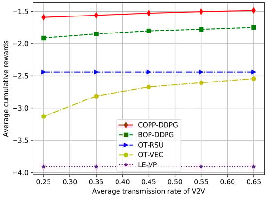 Besides the uplink and downlink transmission rate of the V2I communication between ICV-I and RSU-j, influences the performances of the five algorithms; see Figure 8. The transmission rates between ICV and VEC (V2V communication) are also significant for all algorithms. Figure 8 shows the performances of the five algorithms with the different transmission rates of V2V. Given the curves of OT-RSU and LE-VP, the communication between V2V does not affect the performances of the two algorithms. However, with the increase in the transmission rate of V2V, the average cumulative rewards of COPP-DDPG, BOP-DDPG, and OT-VEC increased gradually, because the higher the transmission rate is, the lower the delay is, and the average cumulative reward increases.