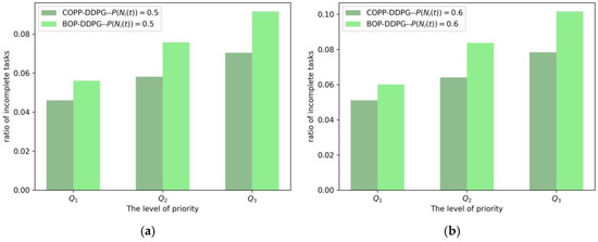 Furthermore, we will verify the performances of the algorithms considering the privacy preservation of ICVs. As mentioned in Section 3.5, pseudonym changing is an effective means for ICV privacy preservation. Figure 9 displays the comparison of the ratios of incomplete tasks for two learning algorithms with different priorities . As shown in Figure 9a, we set the change in the ICV’s pseudonym to follow the Bernoulli distribution with parameter 0.5—that is, the probability of the ICV changing pseudonyms is 0.5; . In terms of average cumulative rewards, COPP-DDPG’s performance is better than that of BOP-DDPG. In addition, the completion rate of tasks with high priority is significantly higher than that of tasks with low priority. This is because the setting of the reward function , which is related to the cost functon , can guide the training of the two learning algorithms (COPP-DDPG, BOP-DDPG). As shown in Figure 9b, the probability of ICV changing pseudonyms was set as . With the incrementing of pseudonym change probability, the higher the privacy-preserving level of ICV, which can be used as VEC, the higher its corresponding privacy cost, resulting in higher cost and smaller average cumulative return.