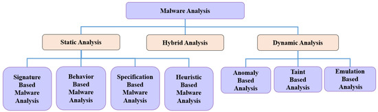 Malware analysis entails both the detection and classification of malware. Malicious or benign malware can be distinguished through detection. In contrast, classification entails determining the specific malware family for a particular type of malware. There are two basic categories of malware analysis: static and dynamic. Figure 1 displays a regularly employed malware analysis taxonomy. Both manual and automated analysis is possible. Manual analysis necessitates subject expertise. On other hand, automatic analysis needs highly developed data science programming skills [6]. The primary mechanism of static analysis is to find binary files without running any software. It operates by taking malware binary’s style signatures. Static analysis is one of the finest methods for identifying typical malware because it is quick and secure [7]. In contrast, during a dynamic analysis, a software’s behavior is investigated, and from these findings, the software’s intentions or purposes are inferred. Although it can detect sophisticated malware, it is time-consuming and prone to security threats [8]. In comparison to static analysis, dynamic analysis is a superior method, but it uses more time and memory and has scaling problems. The focus of our work is on static analysis.