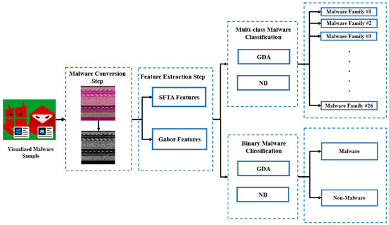 Three steps make up the proposed malware analysis method: (a) malware conversion; (b) feature extraction; and (c) classification. We initially convert the RGB malware images into grayscale malware images for effective malware analysis. The SFTA and Gabor features are extracted from gray-scale images in the feature extraction step. Lastly, the classification is carried out by GDA and NB.