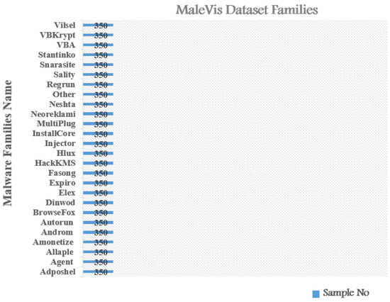 MaleVis (Malware Evaluation with Vision) dataset [35] was utilized to gauge the effectiveness of the proposed method. The MaleVis dataset consists of 14,226 RGB byte images belonging to 26 malware classes which include 25 malware and 1 cleanware as shown in Table 2. These 14,226 RGB byte images were divided into 9100 samples for training and 5126 samples for testing. There are 350 images total throughout all classes, which are evenly distributed. The Malware classes included Adposhel, Agent-fyi, Allaple. A, Amonetize, Androm, AutoRun-PU, BrowseFox, Dinwod! rfn, Elex, Expiro-H, Fasong, HackKMS. A, Hlux! IK, Injector, InstallCore. C, MultiPlug, Neorekla-mi, Neshta, Regrun. A, Sality, Snarasite. D!tr, Stantinko, VBA/Hilium. A, VBKrypt, and Vilsel. The distribution of samples among the different malware classes contained in the datasets is shown in Figure 6. The images resolutions range between 224 × 224 and 300 × 300 pixels. The various malware classes in the MaleVis dataset are displayed in Figure 7.