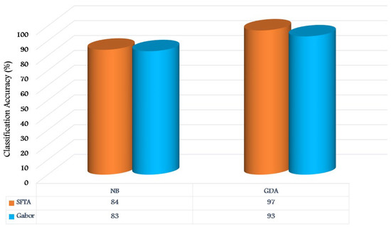 The classification Accuracy-based SFTA and Gabor features across GDA Classifier.