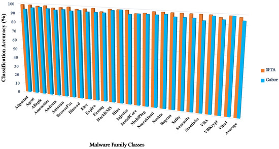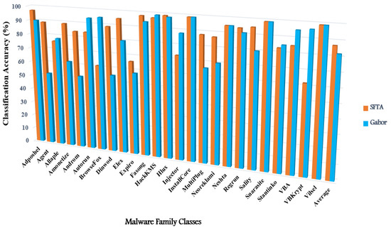 In the majority of recent works such [36], the Neshta class, which is a member of the virus family, had the lowest accuracy. However, the SFTA-NB, Gabor-NB, SFTA-GDA, and Gabor-GDA methods achieved better classification accuracy, specifically for the Neshta class, at 87%, 82%, 98%, and 95%, respectively.