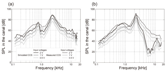 - Shimokura, R.; Hosoi, H.; Nishimura, T.; Iwakura, T.; Yamanaka, T. Simulating cartilage conduction sound to estimate the sound pressure level in the external auditory canal. J. Sound Vib. 2015, 335, 261–268. [Google Scholar] [CrossRef]