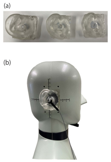 We removed the pinna simulator from the HATS and made a mold, which enabled us to make new pinna simulators with three different hardness levels (A40, A20, and A10), as shown in Figure 2a. We used polyurethane resin because the human skin gel, described above, was made of this material [17]. Although the original pinna simulator in the HATS (original HATS pinna after that) had a concavo-convex surface on the reverse side of the base where it joined with the HATS body, the new pinna simulator had a flat surface. Furthermore, the new pinna simulators did not have a magnet to join them to the HATS. Thus, we used rubber cement (Blu Tack, Bostik Australia Pty. Ltd., Thomastown, Australia) to fix and fill the gaps between the pinna simulator and the HATS body. The masses of the pinna simulators were 42 g for A40, 44 g for A20, 48 g for A10, and 49 g for the original HATS pinna.