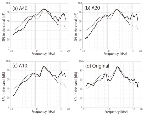 Simulated cartilage-conduction sound obtained by the HATS with different pinna simulators: (a) A40, (b) A20, (c) A10, and (d) original silicon-rubber-based HATS pinna simulator (solid line). The dashed lines indicate the measured cartilage-conduction sound obtained from the participants. The spectral shapes of A10 and A20 became more similar to those obtained from the participants.