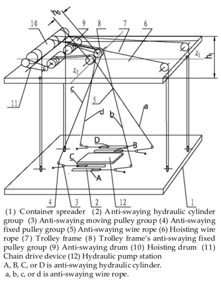 A schematic diagram of the mechanical structure of the hydraulic anti-swaying system is shown in Figure 1. Its primary components include (1) a container spreader (no container is shown below the spreader in Figure 1); (2) an anti-swaying hydraulic cylinder group (A, B, C, and D); (3) an anti-swaying moving pulley group; (4) an anti-swaying fixed pulley group mounted on the spreader; (5) an anti-swaying wire rope (a, b, c, and d); (6) a hoisting wire rope that accomplishes the hoisting function of the spreader; (7) a trolley frame rigidly connected to a running trolley (the trolley is not shown in Figure 1); (8) the trolley frame’s anti-swaying fixed pulley group installed on the trolley frame; (9) an anti-swaying drum connected to the hoisting drum by a chain drive device; (10) a hoisting drum that transfers hoisting power; (11) a chain drive device; (12) a hydraulic pump station that provides oil to the anti-swaying hydraulic cylinder group (2).
