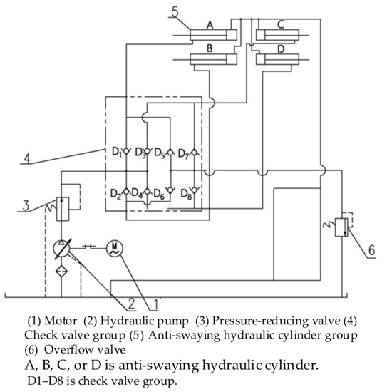 A hydraulic principle diagram of the hydraulic anti-swaying system is shown in Figure 2. The hydraulic system mainly includes (1) a motor, (2) a hydraulic pump, (3) a pressure-reducing valve, (4) a check valve group (D1–D8), (5) an anti-swaying hydraulic cylinder group (A, B, C, and D), and (6) an overflow valve.