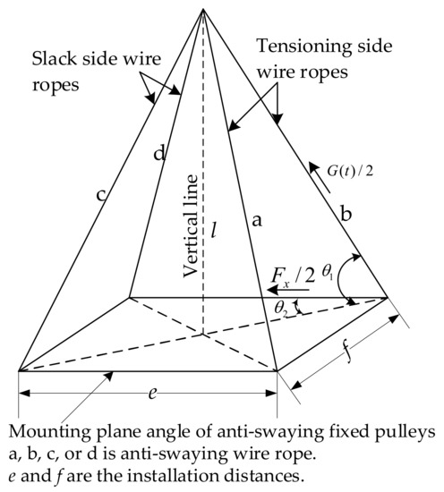 In general, when there is no wind load, the influences of the trolley and the crane on the load swaying are the same. Therefore, for the sake of convenience, only the trolley–crane coupling structure was considered in this study. As mentioned previously, the installation distance, h0, of the two-trolley frame anti-swaying fixed pulleys (8) is much smaller than the transverse size, h1, of the trolley frame, that is, h0 << h1. Therefore, it can be assumed that the four anti-swaying ropes, a, b, c, and d, are suspended at a point P through the trolley frame fixed pulleys; the projection of the suspension point P on the spreader is the intersection point Q, and point Q is the intersection of the rectangular diagonals determined by the spreader fixed pulley group (4). Suppose the load sways to the right with an angle of φ (rad). A schematic diagram of the simplified structure of the crane and trolley–load system is shown in Figure 3. When the load does not swing, that is, when φ = 0, the spatial layout of the anti-swaying wire ropes a, b, c, and d is shown in Figure 4, where θ1 represents the angle between the anti-swaying wire ropes and the mounting plane angle of the anti-swaying fixed pulleys. It is clear that θ1 depends on the height of the load, that is, the length of the hoisting rope when the load does not swing but is in its equilibrium position. θ2 is determined by the installation positions of the anti-swaying fixed pulleys on the spreader. e and f are determined by the installation positions of the anti-swaying fixed pulleys. e represents the installation distance of the anti-swaying fixed pulleys in the running direction of the trolley, referred to as the longitudinal distance of the anti-swaying fixed pulleys. f is the installation distance of the anti-swaying fixed pulleys in the direction perpendicular to the running direction of the trolley, referred to as the transverse distance of the anti-swaying fixed pulleys. The units of e and f are both m. G(t) represents the sum of the tensions in the two tensioning side wire ropes. Fx is the sum of the horizontal components of the forces the two tensioning side wire ropes exert on the load. The units of G(t) and Fx are both N. It is clear that G(t) = Fx, and Fx is also the force exerted by the cylinder connected to the tensioning side anti-swaying wire ropes.