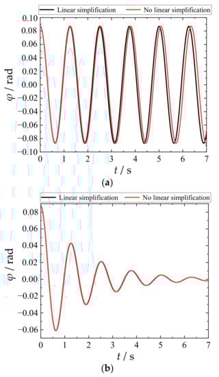 To illustrate the effectiveness of the linear simplification involved in moving from Equation (8) to Equation (9), simulation verification results are presented in Figure 5. Figure 5a shows the dynamic response process for the load swaying angle when there is no hydraulic anti-swaying system (k = 0), and Figure 5b shows the dynamic response process for the load swaying angle when the hydraulic anti-swaying system is implemented (k ≠ 0). Figure 5 indicates that the linear simplification is reasonable and effective.