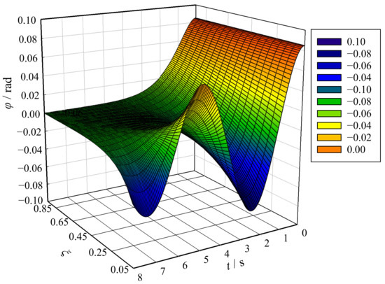 When , that is, when , the anti-swaying system is called a critical-damping hydraulic anti-swaying system, and Equation (13) has characteristic roots of double real numbers equal to . In this situation, the time domain function of the load swaying angle can be expressed by Equation (18):