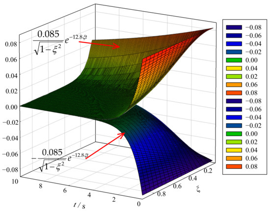 It is clear that Equations (10) and (15) are equivalent when the hydraulic anti-swaying system is an under-damping hydraulic anti-swaying system. When and are known, Equation (15) shows that the change in the swaying angle with time is only affected by the damping coefficient, . Based on Equation (10), the entire oscillatory attenuation process experienced by the swaying angle is always contained between a pair of envelope surfaces, .