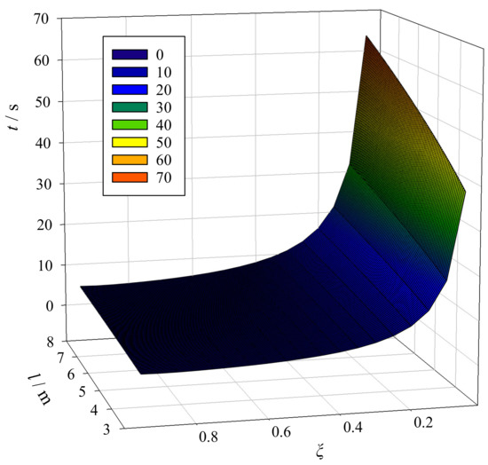 According to Equation (17), when and are known, the attenuation time, , of the swaying angle is determined by the damping coefficient, , and the length of the hoisting rope. Figure 9 illustrates this conclusion. Figure 9 also shows that when increases, decreases from fast to slow. If is small, then increases as l increases; if is large, then remains nearly constant as l changes, indicating that when is large, the anti-swaying effect of the system has a certain robustness to the changes in l.
