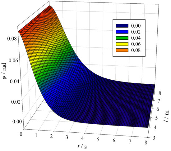 Equation (10) is the expression for the load swaying angle after the trolley brakes. It is clear that the load swaying angle is attenuated in the form of an exponential function. Equations (9) and (10) indicate that the structure parameter, k, the hoisting load, m2, and the hoisting rope length, l, jointly affect the attenuation process of the initial swaying angle, .
