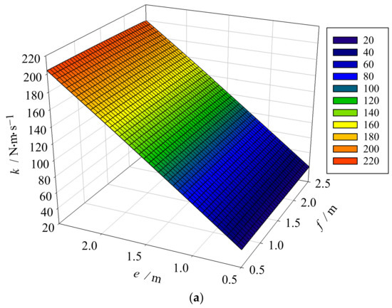 According to Equation (23), when the pressure and size of the anti-swaying hydraulic cylinders A, B, C, and D in the hydraulic system are determined, the longitudinal distance, e, and the transverse distance, f, of the anti-swaying fixed pulleys jointly affect the structure parameter, k. As shown in Figure 12, when f decreases or e increases, k is likely to increase, which is favorable for the load anti-swaying effect. In engineering applications, if common standard containers and anti-swaying cylinders that are convenient to install are considered, and can be selected.