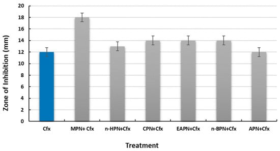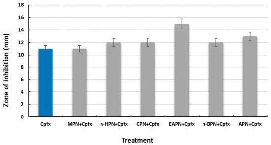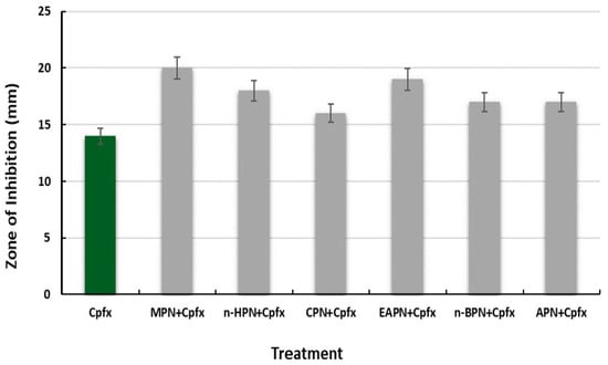 In the case of S. typhi, the zone of inhibition of ciprofloxacin (Cpfx) was 14 mm (Figure 11) and the inhibition zone is ≥21 mm for S. typhi by ciprofloxacin according to CLSI standards (Table 2). By using P. nigrum extract + Cpfx, the zone of inhibition was increased to a maximum of 20 mm with MPN. EAPN + Cpfx zones of inhibition increased to about 19 mm, while the n-HPN + Cpfx zone of inhibition increased to about 18 mm. The zones of inhibition for the remaining combinations, i.e., CPN + Cpfx, n-BPN + Cpfx, and APN + Cpfx, were increased to about 16–17 mm.