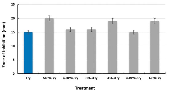 For S. aureus, the zone of inhibition of erythromycin (Ery) was 15 mm (Figure 3), and the inhibition zone of S. aureus is reported to be ≥ 23 for erythromycin (CLSI standards, Table 1). However, when erythromycin was used in combination with APN, the zone of inhibition increased by 19 mm, whereas methanolic P. nigrum extract (MPN) increased the zone of inhibition maximum of 20 mm when used with erythromycin. At the same time, EAPN + Ery increased the zone of inhibition by 19 mm. The zone of inhibition for all the other extracts (n-HPN, CPN, and n-BPN) increased in the range of 15 to 16 mm when combined with erythromycin.