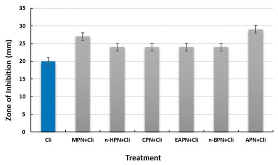The inhibition zone of S. aureus is ≥21 mm for clindamycin (Cli) according to CLSI standards (Table 1). For the S. aureus resistant strain, the zone of inhibition of Cli was recorded as 20 mm (Figure 4) without plant extract. By using APN P. nigrum extract in combination with Cli the zone of inhibition increased to a maximum of 29 mm. MPN + Cli increased the zone of inhibition by 27 mm, which was clinically significant. The remaining extracts of n-HPN, CPN, EAPN, and n-BPN increased the zone to 24 mm in the presence of the antibiotic clindamycin.