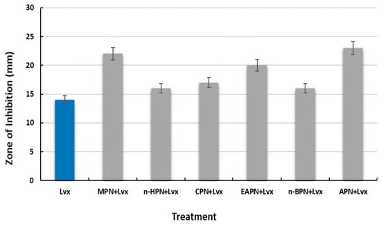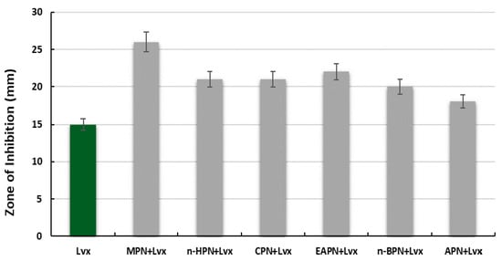 For S. aureus, the zone of inhibition of levofloxacin (Lxv) was 14 mm (Figure 5), whereas the inhibition zone of S. aureus is ≥ 19 mm for Lvx, according to CLSI standards (Table 1). By using P. nigrum extract, the APN + Lvx zone of inhibition increased to 23 mm. P. nigrum MPN + Lvx increased the inhibition zone to about 22 mm, and EAPN + Lvx increased it to 20 mm. The CPN + Lvx zone of inhibition increased to 17 mm, and the n-BPN + Lvx zone of inhibition increased to 16 mm.