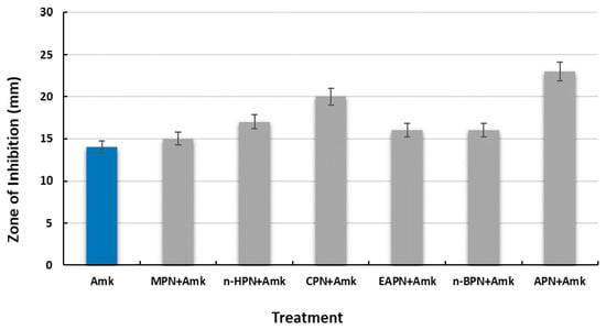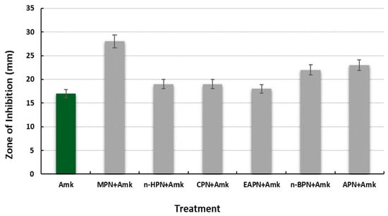 In the case of S. typhi, the zone of inhibition of amikacin (Amk) was 17 mm (Figure 9), whereas the inhibition zone of S. typhi is ≥17 mm for amikacin according to CLSI standards (Table 2). By using plant extracts of P. nigrum, the zone of inhibition increased to a maximum of 28 mm with MPN, which was significant because the value falls within the sensitive zone. The plant extract n-HPN zone of inhibition increased to 24 mm, and the APN zone of inhibition increased to 23 mm; the n-HPN, CPN, and EAPN zones of inhibition increased to 19 mm.