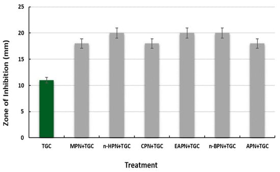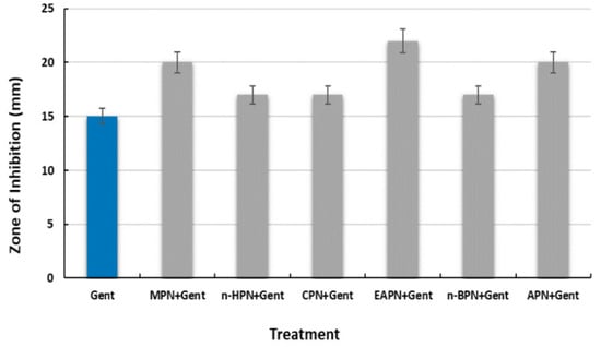 According to CLSI standards, the zone of inhibition of S. aureus by gentamicin (Gent) is ≥15 mm (Table 1). In the present work, S. aureus also showed a 15 mm zone of inhibition by Gent (Figure 8). Using plant extracts, the P. nigrum extract zone of inhibition increased to a maximum of 22 mm with EAPN, which was very significant; whereas the MPN and APN zones of inhibition increased to 20 mm and the n-BPN zone of inhibition increased to 18 mm. The n-HPN, CPN, and n-BPN zones of inhibition increased to 17 mm.